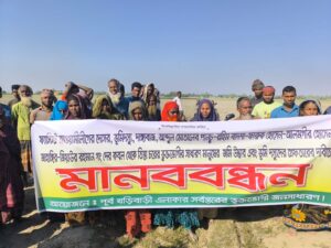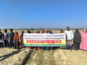 মানববন্ধনে বক্তারা ঘোষণা করেন, “জমি দখলের নামে এলাকায় আতঙ্ক সৃষ্টি বন্ধ না হলে আমরা বৃহত্তর আন্দোলনে যেতে বাধ্য হবো।” এ সময় তারা প্রশাসনের সরাসরি হস্তক্ষেপ, দখলদার চক্রের বিরুদ্ধে আইনগত ব্যবস্থা এবং চরের জমির সঠিক পরিমাপ নিশ্চিতের দাবি জানান।